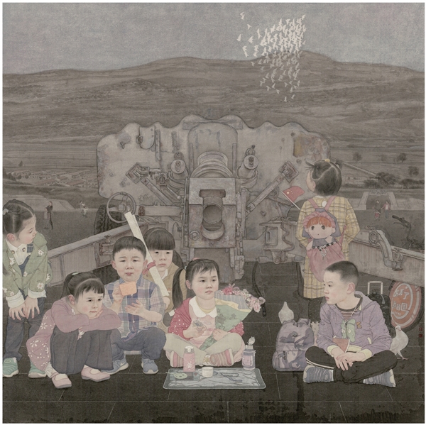 谈及此次入展的作品,张爱军分享了自己的创作思路:“我想通过作品传递‘厚植爱国情怀’的想法,所以把目光放在了孩子身上——他们是新生力量,是祖国的未来。”作品刻画了孩子们在安稳的日常生活,认真聆听新中国的辉煌革命史之情形。“能参加这么高规格的全国性展览,我特别荣幸。”张爱军说,创作时他一直想着“铭记历史、珍爱和平”这八个字,他希望通过这幅画,既为孩子们厚植爱国情怀、埋下报国种子,也彰显了新生一代捍卫和平、创造美好生活的决心。