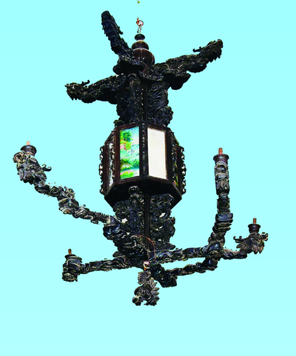 九龙灯 这件宝物被称为“东方奇观”,乔家现保存有两盏。据专家介绍,迄今为止,在我国还没有发现第三盏。九龙灯用珍贵的乌木雕刻而成,灯高91公分、重7.9公斤。上面雕有九条龙,故称“九龙灯”。九条龙分上下两层排列,上层四条,下层四条,灯身下方是第九条龙。下层四条龙的龙身可以来回旋转弯曲,中间有轴,弯曲后可以组成一个“卍”字形,“卍”字顶端是龙头,龙头上装有蜡签可以点蜡烛。灯身呈八棱形,共有八个平面,其中四个面装的是水银镜,另四个面装的是风光玻璃镜,蜡烛一旦点燃,通过水银镜的反射,四支蜡烛就变成了八支,显得整个屋子特别亮堂。灯的顶端是葫芦造型,葫芦嘴上置有铜钩,可以悬挂。这两盏九龙灯是慈禧太后赐予乔家的宝物。1900年,八国联军攻进北京,慈禧太后带着光绪皇帝逃往西安。路经山西时经费吃紧,乔家慷慨解囊赠银三十万两,解了慈禧太后的燃眉之急。回京后,慈禧太后将九龙灯和“福种瑯嬛”匾额一起赐给乔家。