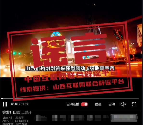 真相:近日,有网民发布“突发!山西忻州遭遇6级地震,多地震感强烈”等不实信息,引发关注。经中国地震台网测定,2025年12月13日17点20分,山西省忻州市忻府区发生3.4级地震,震源深度24千米。地震发生后,忻州市、忻府区立即派出工作队赴震中地区进行实地调查,本次地震未造成人员伤亡和财产损失,社会秩序正常。