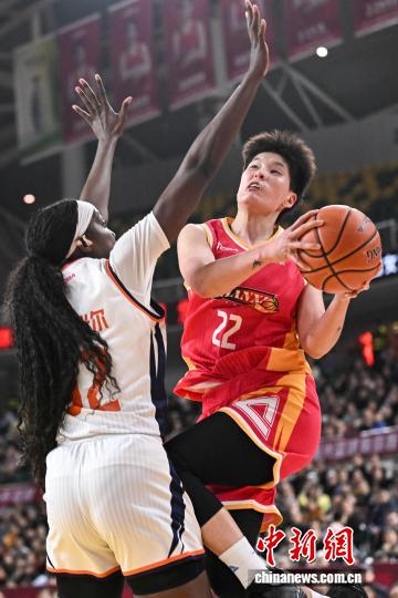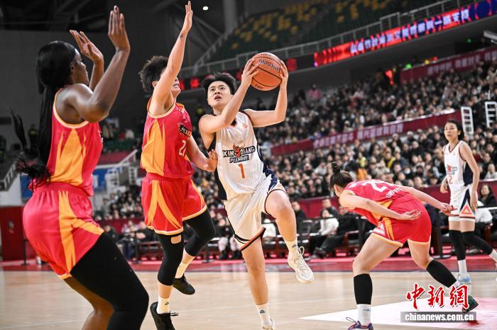 1月9日,山西队球员惠特尔(红衣)在比赛中带球突破。当日,在太原举行的2025-2026赛季中国女子篮球联赛(WCBA)常规赛第14轮比赛中,山西竹叶青酒队主场以96比73战胜新疆天山队。中新社记者 韦亮 摄
