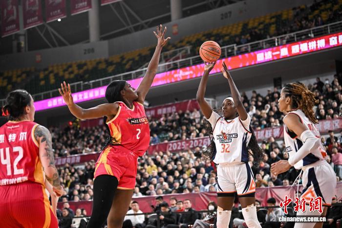 1月9日,新疆队32号球员莫普雷米尔(白衣)在比赛中投篮。当日,在太原举行的2025-2026赛季中国女子篮球联赛(WCBA)常规赛第14轮比赛中,山西竹叶青酒队主场以96比73战胜新疆天山队。中新社记者 韦亮 摄