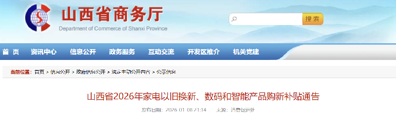 通告同时明确,本通告未规定事项,按《山西省商务厅山西省发展和改革委员会山西省财政厅关于提质增效实施2026年消费品以旧换新政策的通知》有关规定执行。