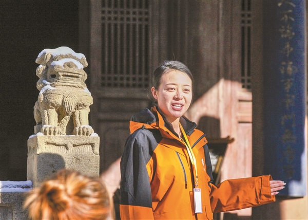 榆次老城导游王雅姿为游客服务。