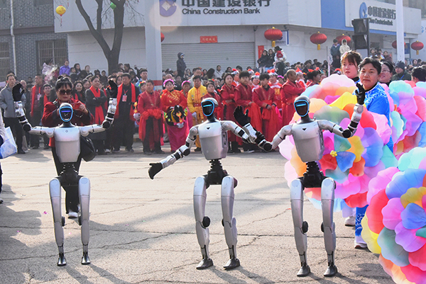 静升镇方阵尤为吸睛。赛博朋克方队潮范儿十足,宇树AI智能机器狗灵动起舞,时尚舞者活力四射。抖音热舞、山西小花戏与多地特色舞蹈巧妙融合,千年非遗民俗在数字时代焕发出夺目光彩。