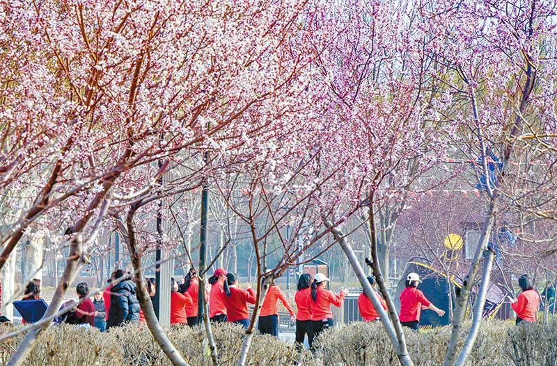 市民在平遥古城迎薰公园观赏桃花、健身休闲