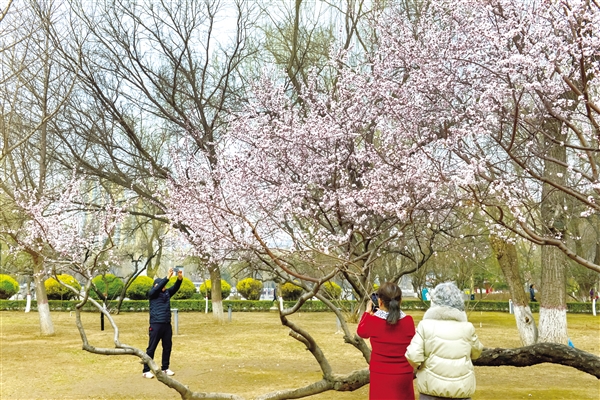 漫步公园,粗壮的树干或横卧于地,或舒展向空,粉白色的花瓣层层叠叠,在微风中轻颤,引得市民纷纷驻足留影寻春。