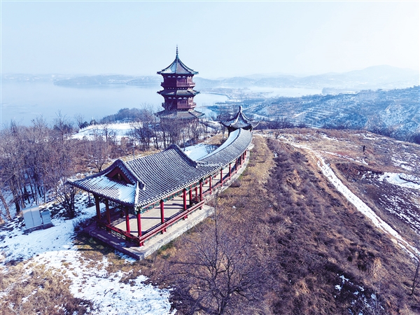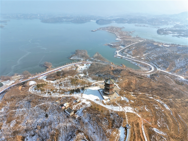 航拍视角下的榆社县云竹湖景区 以碧绿色湖水为主色调 周边白、红、蓝等色彩点缀其间