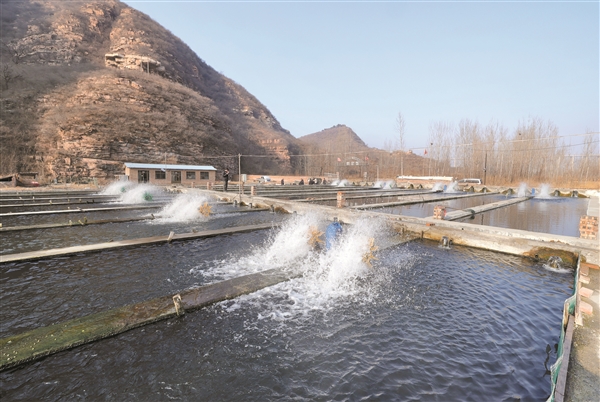 左权县桐峪镇下武村村民在鲟鱼养殖场内喂饲鲟鱼